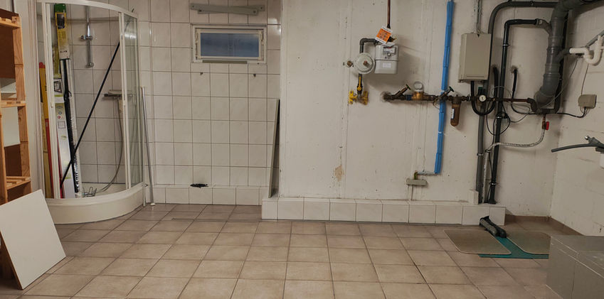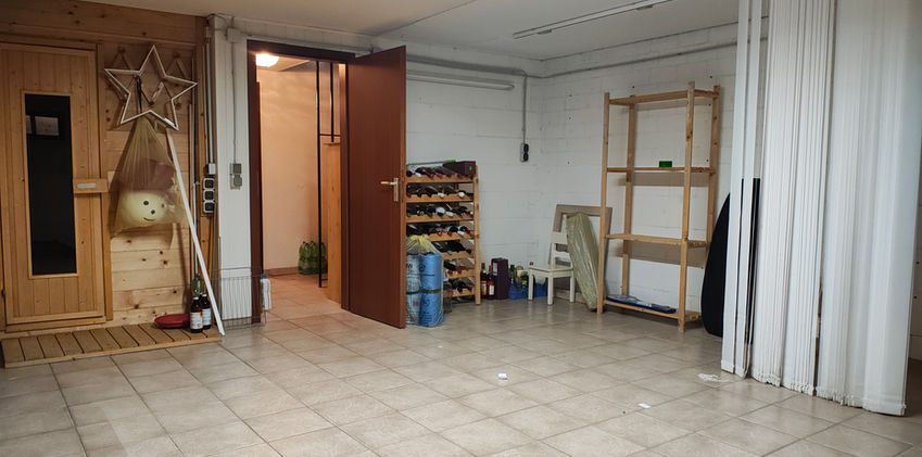 Im Keller befinden sich zwei große Räume. Im Waschraum befindet sich ebenfalls eine weitere Dusche und im ehemaligen Partyraum befindet sich noch eine Einbausauna.